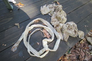 緑地の見回りと気配り(土地と人と風土・考) 2025/09/17 wed くもり 25℃ ![]() 小屋の薪ストーブの煙突掃除の日。 あとひと月もすれば火の気が欲しい日が間違いなく到来するので事前に手を打つのだが、いつも煤はほとんどなく肩透かしを食らう。今日も、煤はあまりなかったが段取りミスで煤をかぶり一部は小屋の床を汚した。昨シーズンはずいぶん焚いたが薪が良いのか煤がないのは助かる。 この一人作業の間に感じた事柄の独り言。 ■やや公的な緑地管理と住民参画 現在、NPO苫東コモンズは骨格緑地「遠浅樹林地」の70ヘクタールと、苫小牧市静川と厚真町共和と豊川などの山林約70ヘクタールの計140ヘクタールを巡回や管理作業の視野に入れている。これをとりあえずに「気配り面積」と呼んでおこう。 この面積は苫東の計画緑地2800へクタールのちょうど5%にあたる。工業地域の緩衝緑地は自由にアクセスできる公道を含むが、小屋の前は山菜採りと冬季のシカ猟以外では通常人の出入りがない。土地所有者も災害や山火事防止の巡回、林道刈り払い以外は緑地を見回ったり積極的な管理作業はとくに行わない。 そんななか、NPOではエリアを区切って高い頻度(週1~3回、通年)で協定に基づく林の利活用活動を継続し、四季を通じて毎週、数人から15人が出入りしている。地域にとっても大事にしたい里山的な樹林地だから適切な方向性を持って維持してほしいところだが、現状は幸い山火事の発生や事故などはなく、消極的だがほぼつつがなく管理されている。 ただ、消極的管理にもう一つ実効性を加味するために、加えたいことがある。それはこの地域に住む住民の巡回などの参画である。用地分譲を行う企業従業員のほとんどは地域外からの勤務者であろうと考えられ勤務後はこの地を去るが、土地は、もともと農家が所有していたものを買い上げて保有しているもので、さらにそのはるか以前は、先祖の誰かが開拓でこの地を踏んだ。 地域開発の買収に応じて土地を手放し、主は不動産業の法人に代って現状維持(自然放置)され、一方、元の主や子孫は地域のどこかで遠くからこの土地を眺めているわけだ。 その土地に近年は、地元から有効利用、適正利用のつぶやきのようなものが聞こえる。愛着の目で見つめられていたのである 個人的にはガバナンスがうまく機能すればとても良いことだと思う。2025年、コモンズでは土地の自然に好感と共感を感じる人を新しく会員として迎えているが、午前はその会員のひとりが林道の巡回に来ていて、午後は、別の会員が町内のエリアに工場が建設されるという説明会にほとんど参加者がいないことを嘆いていた。なにかわたしが期待していた構図が出現しそうな気配がすこしある。 地域の自然環境と社会環境に関心を寄せる人は、残念ながら決して多くないと見積もられるが、土地と地域住民の関係は意外となくならないもので、広大な苫東の緑地のばあいは特に「住民がどう関わるか」が持続的な環境維持の方向を左右する。ここは賢明な関係性を築きたいものである。 やはり「土地」は「風土」と不可分であり、プロジェクトを推進する当事者を「旅人」とすれば、土地に住む人やわたしのような「土人」になりかかったものたちは、その「風土」から離れられず少なからず関心を寄せているのだ。土地は束の間の所有だが、風土は地域の永遠の共有である。 ■なつかしいヘビの抜け殻は1.8メートル ![]() ![]() ![]() 昼過ぎ、煙突掃除が一段落してテラスに座ると、脇に細長いものが見えたので近寄ると、なんと久々のヘビの抜け殻だった。今年は小屋周りでヘビに出会うこともなく(タヌキやアライグマが出入りするせいもある)、抜け殻は5,6年ぶりになる。 よく見ると、長い、そして太い。メジャーをあてると180cmもあった。写真上は左のスケールが1mでとめてあるからその長さの見当がつくだろう。頭をテラス側に沈めほぼ完成形の殻であり、目も口もきれいに抜けていた。 下左が丸めた抜け殻、その右はコシアブラの毛虫の巣。ヘビは栄養さえ十分であれば年2,3度も脱皮すると言われ、かつて小屋の内部に蛾が大繁殖した数年間は、絨毯に落ちた蛾の胴体を食べるためヘビがまさにたむろし、最高で年間7本の抜け殻を小屋内とベランダや床下で発見した。 今回の久々の脱皮は餌が十分だったと想像されるが、その餌となったのはおそらくテラス脇に生えているコシアブラとヤマグワに発生した毛虫(9/4記事参照)ではないか。写真のように繭でちょうちん状になった枯れ葉から黒い毛虫が約半月のあいだ落ち続け、ここでの看板彫り作業をあきらめたほどだった。 脱皮の痕跡は、往時を振り返ると懐かしく、うれしい。まるで流れ星を2,3個連続してみたような朗報である。というのは大量の脱皮が見られたころ、小屋に「ミドリちゃん」という愛称を持ったアオダイショウ(写真下右/H26)がいて、まるで小屋の主のようにベランダでわたしを迎えてくれたものだった。今回の抜け殻