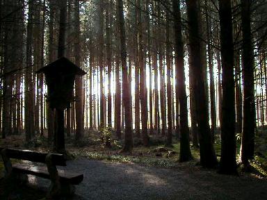 ヨーロッパトウヒの普通の林。ベンチは日向ばかりではない。キリスト像も。
