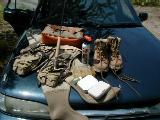 左;こんなアクセスで期待がふくらむ。右;身に着けるタックル、ギアを広げる。