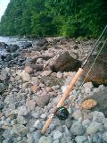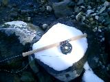 先客は3人。ひだりの大岩の下で黙々とフライのロッドを振っている。わたしは手が凍え