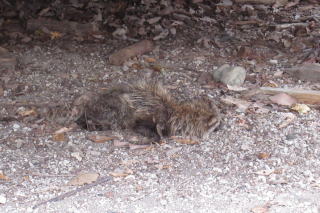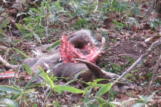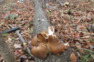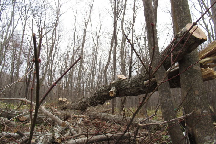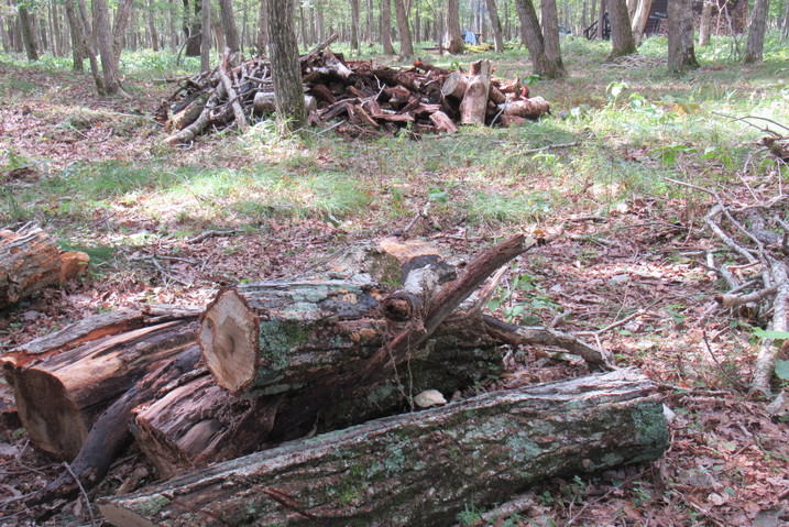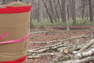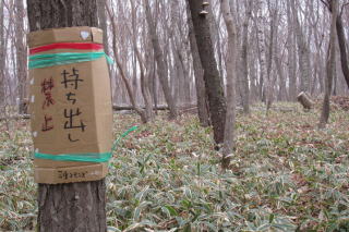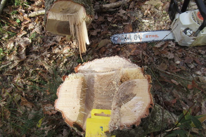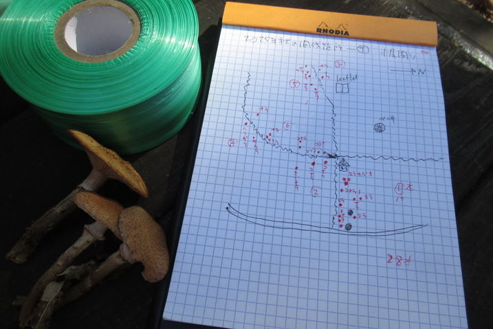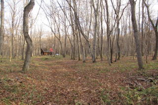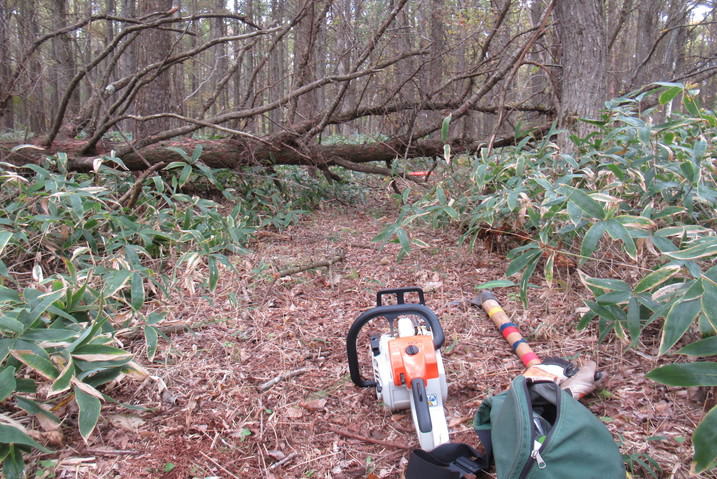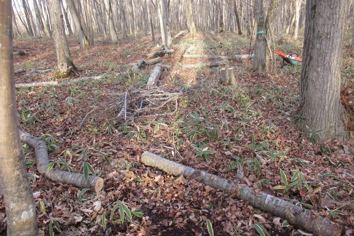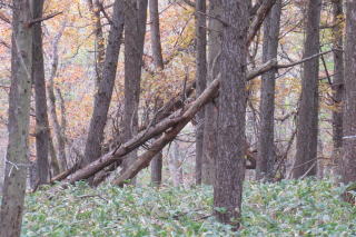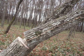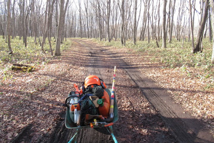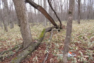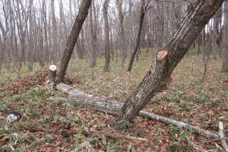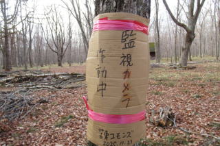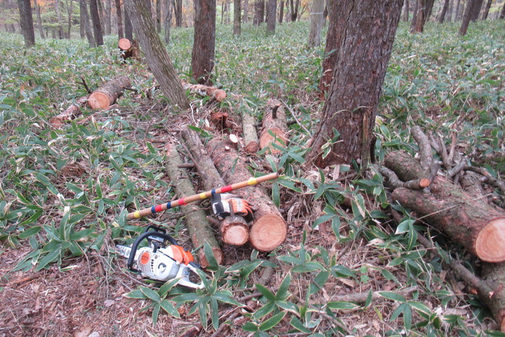 | 3年越しの掛かり木とタヌキの処理 2025/11/19 wed くもり 9℃ 中-2℃→15℃ ![]() 日曜日に小屋泊りしたnaka-f さん一行は、翌朝の雨上がりにフットパスを一周した折、わたしが前回宙ぶらりんにしておいてきたアカシヤを、みんなで引きずり降ろしたとの連絡が届いた。この連携プレーや良し、である。仕事始めにまずこれを玉切りして径わきに片づけた。小屋に至る市町村界の道路沿いでは、基本的に風倒木、ツル、枯死木、掛かり木などはいつもないように気を使ってきたものである。 ところが、このアカシアから南に100m、問題はもう3年越しになる写真の掛かり木があった。もう3年である。右手前と左のサクラもそうだが、左から沢筋の南風を受けて倒れ、いずれも掛かり木になっている。右奥は実は直径が30cm近い2本のナラで根返りしているために枯れはしないので、ポータブルウインチを使っていずれ引かざるを得ないとふんで、伸び伸びになっていたのである。危険だったり、面倒そうだったりすると、つい先送りになる。そしてやっぱり、一筋縄にはいかないことが多い。 ![]() 手前のナラはまず掛かっているアズキナシを慎重に倒してから本玉伐りをした。結果、割れが入って再び隣に掛かってしまった。さらに本玉伐りを3,4回繰り返していよいよ直立しそうになったところでやめた。次回、フェリングバーを使って回転させて処理することができるだろう。 一輪車にチェンソー2台と燃料と小道具を積んでの移動だが、緩やかなのぼりで休み休み小屋に戻ると1時近かった。今日の仕事はもうひとつ、ベランダ下で死んでいるタヌキの躯の片づけである。放置しておけば、また近くのタヌキが食べると予想はできるが、万が一、ベランダ下から腐乱臭がしたりすれば大いに困る。落ち葉集めのレーキを使い大きめのスコップに載せ、小屋から50m程離れたくぼみに捨てた。 実は、今年の1月も、小屋のベランダの下に設置した動物用センサーに、タヌキが映って、このタヌキはベランダ下に置き去りにしていた死んだタヌキを食べ始めた。コリコリという音まで出して、衝撃的シーンだったが、11/15、再びベランダの下に死骸のようなものを見つけ、今日、処理することになったのだ。 この食物の連鎖のようなものの理解というか観念というか、現在の生活環境の中ではなかなかストンと理解できない。わたしたちは完全にそのような食物連鎖の中にいない。いわば、都市の文明生活いうものが生き物の連環の中に存在していないからかもしれない。 小屋の周りには「まほろばコース」というルートを命名しているが、「まほろば」といういわれも実は、その木立にひっそりと囲まれたそこが、手負いのシカにとって最後の息を引き取るにふさわしい死に場所だったと感じたことに始まる。最後は静かな、何者にも犯されない場所を選ぶということか。小屋のベランダが、タヌキたちにとってのまほろばなのだろうか。 小さな雑木林で展開される野生たちのプロフィール、その向き合い方をわたしはまだ知らない。 確信犯的横取りにどう対応するか 2025/11/22 sat 6℃ 中2℃→20℃ 「3年懸案掛かり木」の続きをすべく一輪車に荷物を積んで出かけた先の風景がちょっと違う。300kg近い長さ2m程の丸太4本などがない。付近を見ると、シカ猟のハンターが使う林道から林床に轍らしいものが残っていた。 また、やられた。長材の丸太状態なら大丈夫と予想したのが甘かった。先方はチェンソーで短く玉切りして積んだらしい。悔しいことに、チェンソーの切りくずを見るとわたしのチェンソーよりもはるかに切れるものを使っている。 かくなる上は、どうすべきか。問題は小屋の前の大量に並べたミニ土場だ。やはり「監視カメラ設置中」の段ボールプレートを掲示することが手始めかもしれない。 横取り、盗みという確信犯的な悪意が日常生活で対応することがないだけに、どう処置すべきか妙案が浮かばない。現場に残された2本の丸太の木口に「横取りはやめて」と赤いマジックで書き切り株にNPOの名前を記したが、やや女々しいかな、と苦笑いせざるを得ない。明日、監視カメラを設置しておこう。 昼、1時ころにもどると kai さんが昼食をとっていた。3時過ぎはyama-ka さんが顔をだした。二人にも横取りの話をしたが、やはり妙案らしいものはない。 監視カメラ設置の告知2枚 2025/11/23 sun くもり 6℃ ![]() シカの落葉食と夜間の群れを確認するために購入したカメラ「トレイルカメラ」の取説を読んで、昼前に懸案の小屋周りのミニ土場に写真のようなにわか仕立ての段ボールを取りつけた。よく目立つ2か所だが、監視されていると知っただけで横取りをやめるかどうか、わからない。しかし手立てはわずかだ。今回発覚した掛かり木の現場、それ青空トイレ・「leaf-let」前にも10本分の丸太があるから、ここにも、持ち出し禁止の、言わずもがなの段ボールを取り付けておこう。 家人は、NPOの会員になって一緒に汗を流して作業するよ