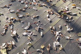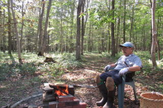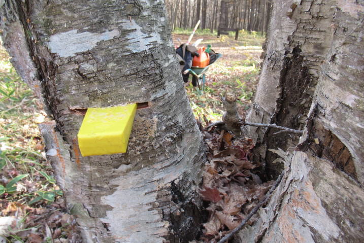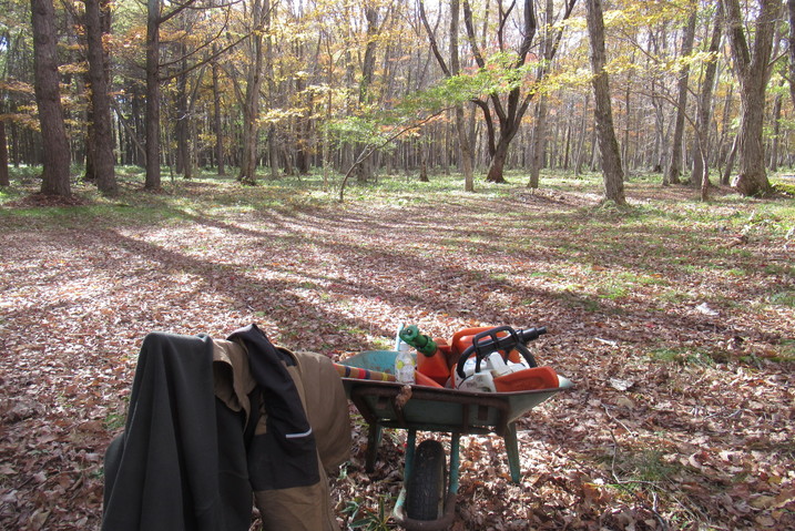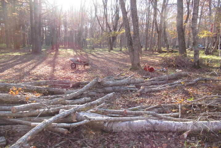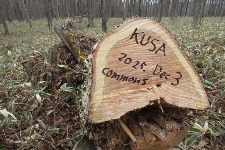 | 腐朽廃材を前にして 2025/10/2 thu 23℃ 中18℃ ■保育年サイン6基完成 ![]() 雑木林の保育年表示を6基、リニューアルした。枕木を使ったのでボリューム感がでて、サインとしてばかりでなく構造物のような存在感がある。これは風景づくりにも寄与する。なにしろ、のっぺらぼうの雑木林は「人工工作物」を待っているのである。 この画像の平成7年といえば、NPO苫東コモンズの前進ともいえる苫東地区森林愛護組合が市民や関係者とともにノコギリで除間伐をしていたころだ。あれからざっと30年。ちょっとした記念碑になる。 ■腐らすか、燃やすかの選択について ![]() エントランスの看板をリニューアルしたついでに、旧看板に色を添える目的で積んだ薪のオブジェが腐っていたので周辺の枝とともに三差路の反対側に寄せた(画像上部)。ちょうど太い危険枝が何本も見つかったので、高所チェンソーで処理したところ、こちらも相当の材が貯まった。いずれも腐朽した材である。集めると相当なボリュームいなるけれども、出来れば燃やせるうちに燃やす方が、なにかと無難であった。 そこで整理してみた。考えてみると除間伐で発生する枝は歩きやすさと手入れの見栄えのためにコモンズは元来小さな塊として集めるようにして来たが、この時点で燃やすと手入れ後の林はスッキリする。もし燃やさない場合は、1,2年後以降に薪ストーブの焚き付けにする。さらにその以後は、10年単位で放置し腐って時点で林内に散らす…。 この最後の手段は腐朽材の山を見ながら考えた新しいアイデアである。ボロボロに腐ったらそれが可能で、早々に一部を実施するところ。ただ懸念するのは、その腐った腐朽材の山が小動物の棲み処になっていないか。幸いこのところの実験では、ミミズ以外はカナヘビ程度。ネズミやヘビは出てこなかった。 ボリボリ始まり、ガン飛来 2025/10/04 sat 晴れ 23℃ ![]() ようやくボリボリが出てきた。どこにでもまんべんなく、というのではなく、山仕事などで一昨年まで足しげく歩いたあたり。昨シーズンではないあたりが興味深い。 採らずに残したスドキがいよいよ綿毛を飛ばすところ。10年ほど前に遠浅から花穂のみ積んで挿したものが良く増えた。小屋周りがフタリシズカ群落からスドキ群落に変わる日は近い。 ![]() これがボリボリ採取途中の収穫。このあと、焚き火の20mさきにもうひとつ群れを見つけて採集。お隣さんに日頃の野菜のお礼にお裾分けだ。 ![]() 焚き火は楽しい。林内を歩くついでに乾いた枝を集めて燃やしいている間に、小屋周りは整頓されていく。今日の仕事は枕木6本の泥を落としていつでも使えるように積んだ。雨で洗い流されれば自ずと使い道も見つかるだろう。 それと先日採材して運んだシラカバの風倒木を玉切りして小屋裏で割った。次から次へと仕事がやってくるというか、見つかる。ボリボリなどは仕事でなく娯楽なのに、どこか季節の勤めのような感があって、アソビでなくマストなのである。 とは言いながら、小屋のライブラリーの読書は30分でもするようにしている。今日は坂本直行さんの『開墾の記』のエンディング部分。読書時間を労わるように、少しずつ読み進み開拓時代を共有するのである。あと、池澤夏樹著『アマバルの自然誌』。 やはり秋が近い、もうすぐ冬なのだ、と思ったのはガンの声を編隊の初見。テラスの空いた空に数10羽の精悍な姿が見えた。あと20日で紅葉まっさかりに本当になるのだろうか。 木の枝を拾い燃やす愉しみ 2025/10/11 sat くもり 16℃ 中8℃ 安来、松江への旅行から帰って、昨日は急いで庭の花の半分を片づけた。花々は当方の栄養診断と水管理よろしくモリモリに育ったからハンギングやコンテナの中の根のからみがすごい。来年使える自家製(ピートモスなど)の土を振るっても、植物体と根がらみの用土は大きな袋5つ、重さ50kgほどあった。今日はこれを小屋のわたし専用の穴に運び降ろした。そして穴は全然埋まらない。雑木林はこれら腐朽を待つものをかように寛容に飲み込むのである。このような寛容さ、生き物全てを受容する底なしの受け身は雑木林の特徴的な属性で、さらにアウトロー、世捨て人、罪人、狂人も受け入れてきたとものの本にはある。それはあるところでアジールと呼ばれてきた。 ![]() 小屋に来るたびにまずやることは焚火をおこすこと。ベランダ下に置いた焚き付け用ミニコミ誌「ひらく」の古紙一枚で、半日以上火焚きを続けるのである。したがって、焚き火スペースの周囲は同心円状に枝が燃やされていく。この快感は実に素晴らしい。 今日は先週やり残したシラカバ風倒木の薪割りを完結させた。ここはエンジンの薪割り機などないから、太い偏屈な丸太を割るのにしばしば難儀するが、モノは考えようで小屋の薪は売り物でないから採寸はどうでもよい。従って割り易く長さを従来の35cmから15cmくらいに狭め細断してしまえば、たいていのものはよく割れるのである。 そんなわけで寸法まち