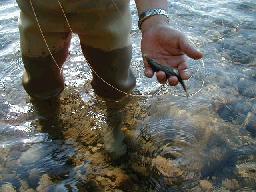 いる。だから、ニンフという水生昆虫の形を模したフライを沈めてゆっくりひきながら魚