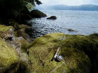 虫もいない。さて、とまず湖に立て込まないで、#4という軽いロッドを振ってみる。フ