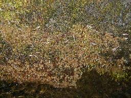 岩の水際についた肌色の粒々は何かの卵みたい、細長い白いものは成虫のカディス。