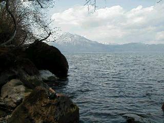 恵庭岳はまだ白い。支笏湖の湖岸は海よりずっと寒い。。
