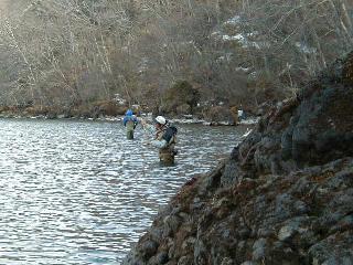 Aポイントの湖岸で談笑した札幌のフライマン。魚は回遊してくるからへたに